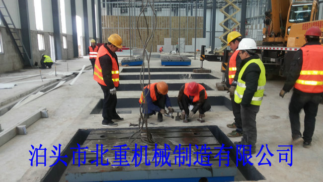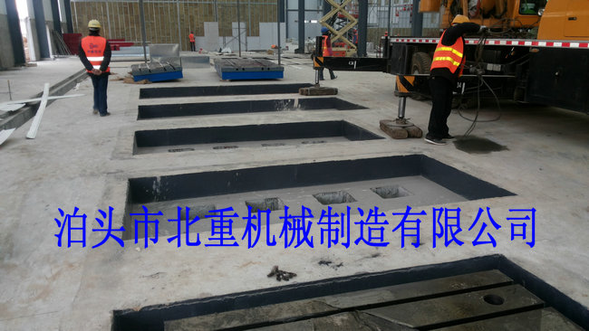 我公司為西門子電機制造的6件2500*4000電機試驗平臺安裝中.電機試驗平臺表面帶有T型槽,方便固定實驗設備.T型槽工作臺采用預埋的安裝形式,這樣的優點是:1.不會出現平臺在實驗震動下的位移.2.減小震動輻射范圍.3.使試驗平臺的壽命和實驗效果大大提高.